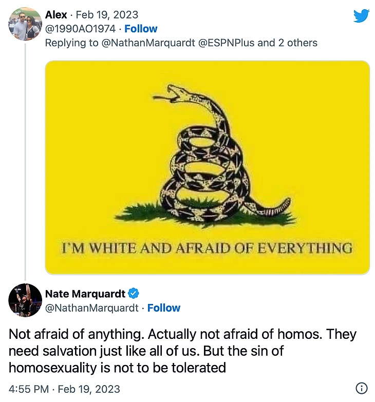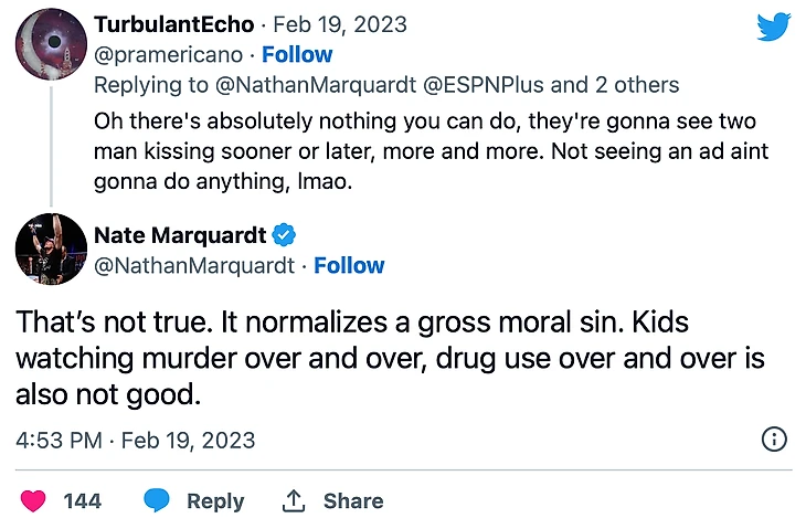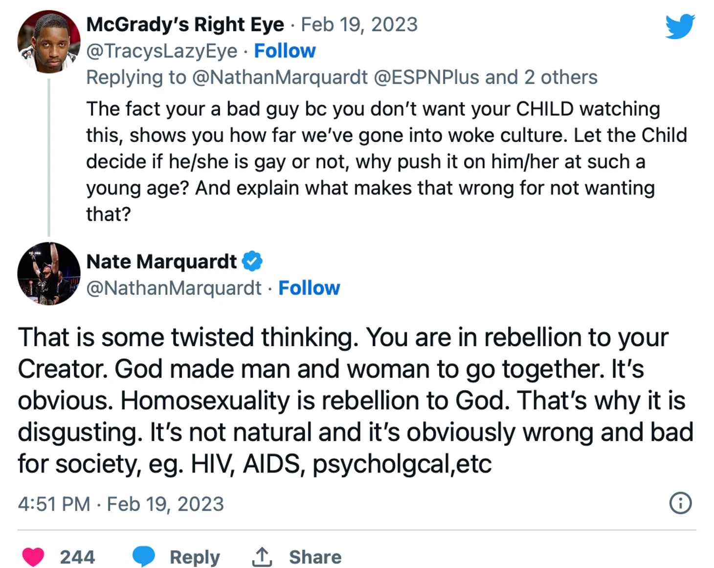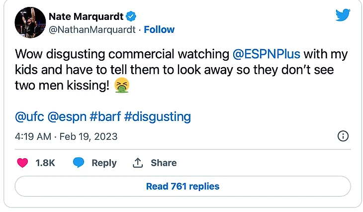 Он написал в Твиттере: «Ух ты, отвратительная реклама, смотрю @ESPNPlus с моими детьми, и должен признаться, что попросил их отвести взгляд, чтобы они не видели, как двое мужчин целуются! @Ufc @espn #barf #отвратительно».