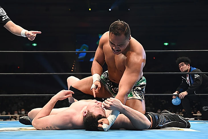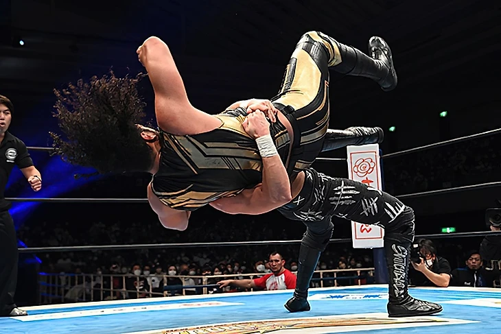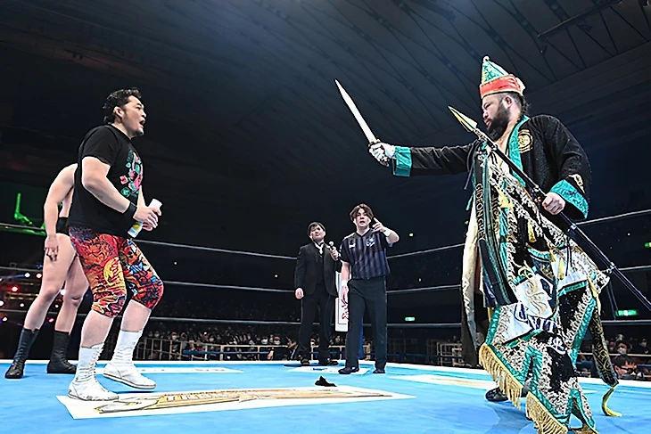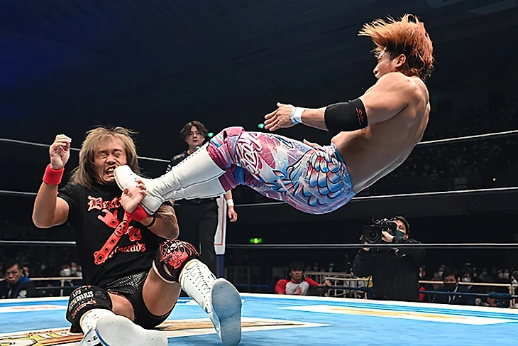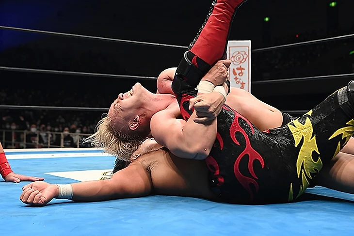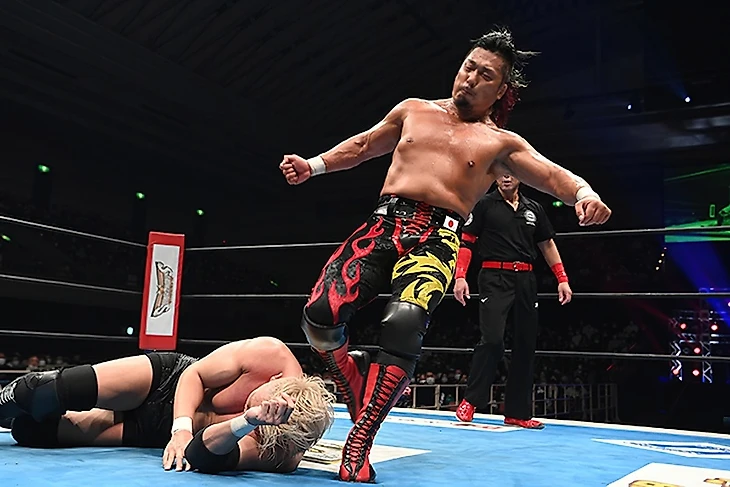 Восьмой матч вечера: Казучика Окада (ч) против Шинго Такаги - матч за чемпионство мира IWGP в тяжелом весе.