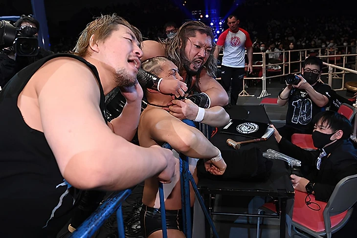 Пятый матч вечера: House of Torture (ч) против Эль Десперадо, Минору Сузуки и Рена Нариты (матч за чемпионство NEVER среди трио).