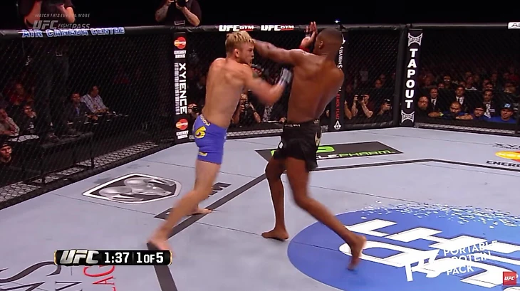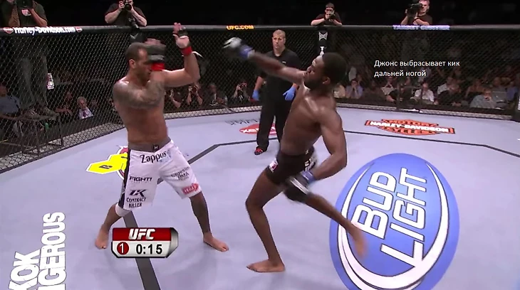Уверенность Джонса в ударах отразилась не только в высоком поднятом подбородке и опущенных руках: он начал бой с невероятного удара коленом в прыжке и добавил ногу с разворота.