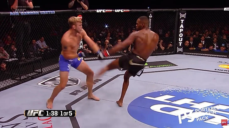 Джонс зарядился на лоукик дальней ногой – Густафссон тут же среагировал.