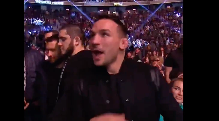 Российский спортсмен сделал фото с украинским боксёром Василием Ломаченко, который также был среди знаменитых гостей. Этот фрагмент трансляции сейчас активно обсуждается в социальных сетях UFC.