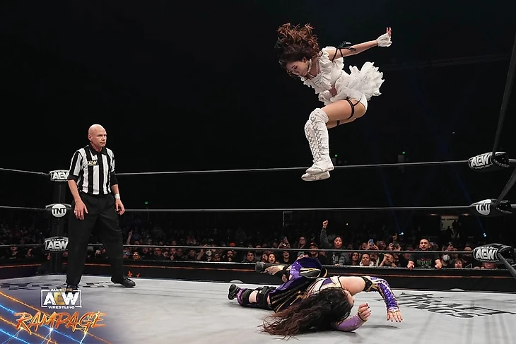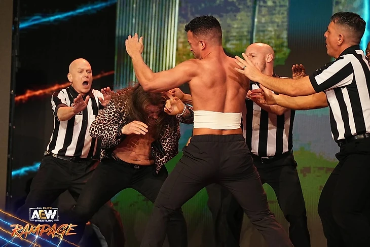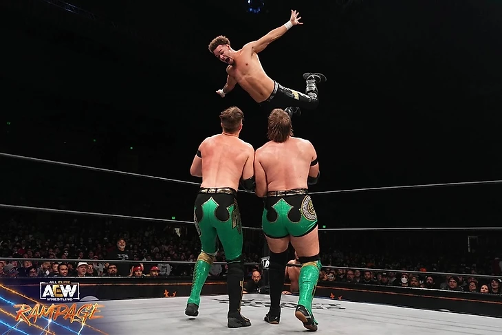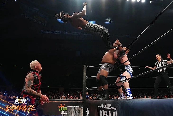 Доброго времени суток, Ассалому Алейкум, дорогие друзья! На связи Юлий Марков, и, я надеюсь, что с небольшим опозданием (а не после PPV) я спешу к вам с обзором на последний Rampage перед Revolution. Шоу обещало нам большой командный матч, появление Пауэрхауса Хоббса, женский одиночный поединок 2 рестлерш из Японии, которые легко могли украсть шоу и принципиальный бой 2 на 2 с участием двух некогда друзей. Давайте разбираться, насколько достойным вышел последний телевизионный еженедельник «Элиты» перед первым платным шоу года. Мы в Сан-Франциско, штат Калифорния, на арене Cow Palace, и шоу началось с многостороннего командника. Dark Order атаковали BCC во время выхода, и завязалась драка, на которую Мартины олетели суисайд дайвами. Возвращаясь в ринг, Top Flight хотели атаковать Флэтчера и Дэвиса, но те сорвали спрингборд атаку и тоже отправились ддратться на рингсайде. Данте и Дариус в итоге были впечатаны друг в друга, Марк вернулся в четырехугольник с Дариусом и матч официально начался. А нам показали, что Мария Кэнеллис, Майк Беннет и Мэтт Тэйвен наблюдают за поединком. Aussie Open провели командную работу, затем атаковали «нелегального» Данте. От следующей атаки второй Мартин ушел, провел двойную харриканрану, после чего Top Flight сообразили синхронные дропкики, и Кайл получил командную работу в углу. По правилам матча 2 команды работают, пока остальные 2 ждут возможности получить тэг. Нейтрализовав Марка Дэвиса на апроне, Данте отправился бить его на рингсайде, а Дариус хотел провести суплекс, однако Флэтчер заблокировал, и Рейнолдс забрал у представителя Top Flight тэг, чтобы провести Кайлу европейский апперкот. Стоило Алексу отвлечься на BCC, он «съел» thrust kick от Флэтчера, тот сменился с партнером, однако с командной работой Рейнолдс справился. Кайл обнаружил себя в углу Blackpool Combat Club, где у него забрал право ведения боя Клаудио. Он запустил Алекса в свой угол, то ушел от потенциальной командной работы и передал «горячий» тэг Силверу, который стал осыпать швейцарца ударами. Кастаньоли быстро отбился, отправил визави на апрон, но атаку в углу Джон заблокировал, провел кик, а потом отправился на рингсайд избивать добрые две трети остальных участников боя. Хай кросс по возвращении в четырехугольник, правда, Клод перевел в бэкбрейкер. А нам показали, что La Faccion Ingobernnable смотрят матч за кулисами на мониторе. Силвер справился с командной работой BCС, вернул в ринг Алекса, тот даже хотел провести атаку, но быстро пал жертвой командной работы. Уйдя от следующей комбинации, Алекс отвлекся на Aussie Open, угодив под страйк Клаудио, а потом пострадал от двойного бута BCC. Естественно, какое-то время Рейнолдс промучился, пока не реверсировал бэк суплекс в крпоссбади. Кастаньоли быстрей вернулся в свой угол для смены с Уилером, который нейтрализовал Силвера, но Алекс собрался и провел Юте двойной стомп в спину. В итоге, пришлось Рейнолдсу меняться с Данте Мартином, пока Уилер передал тэг Кайлу Флэтчеру (вернее, Кайл сам забрал). Мартин встретил соперника атакой с апрона, атаковал и Марка, который вместе с напарником понесся в угол Top Flight, провел двойной хай кросс, нанес Кайлу несколько ударов и полетел на толпу за пределами ринга красивым Tope Con Hilo. В четырехугольнике же Флэтчер получил thrust kick в голову от Дариуса и слингшот флэтлайнер от Данте, однако Силвер разбил удержание двойным стомпом, чем зар