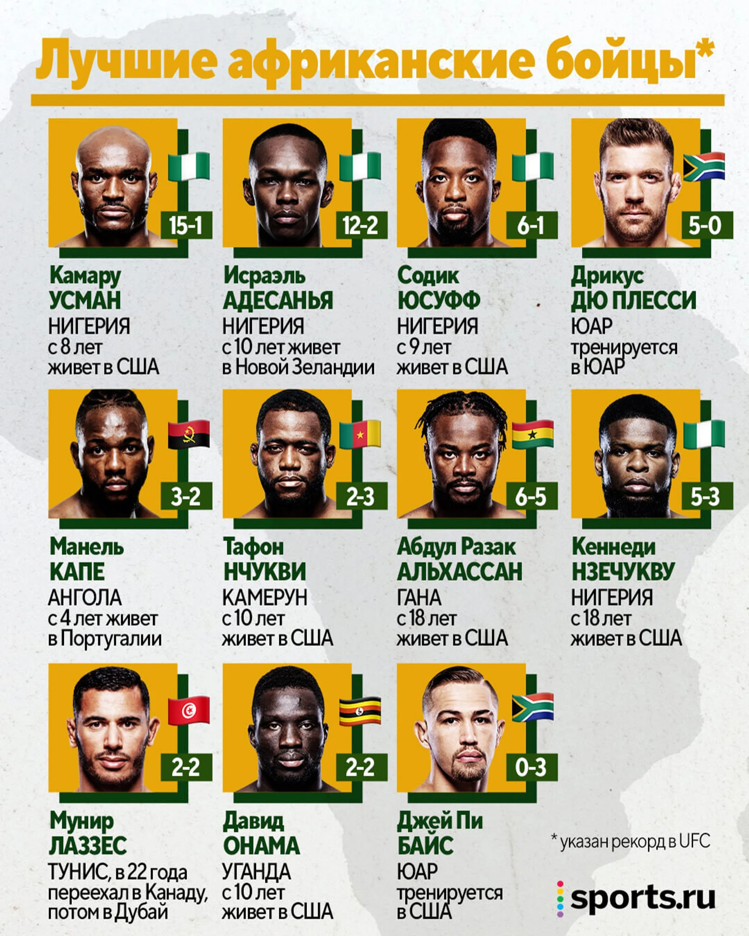 Африка – одна из самых отстающих частей света в UFC (вместе с Азей): у нее всего пять бойцов в рейтингах дивизионов. Сейчас это Усман (первый в полусреднем), Адесанья (первый в среднем), Манель Капе (девятый в наилегчайшем), Содик Юсуфф (12-й в полулегком) и Дрикус Дю Плесси (шестой в среднем).