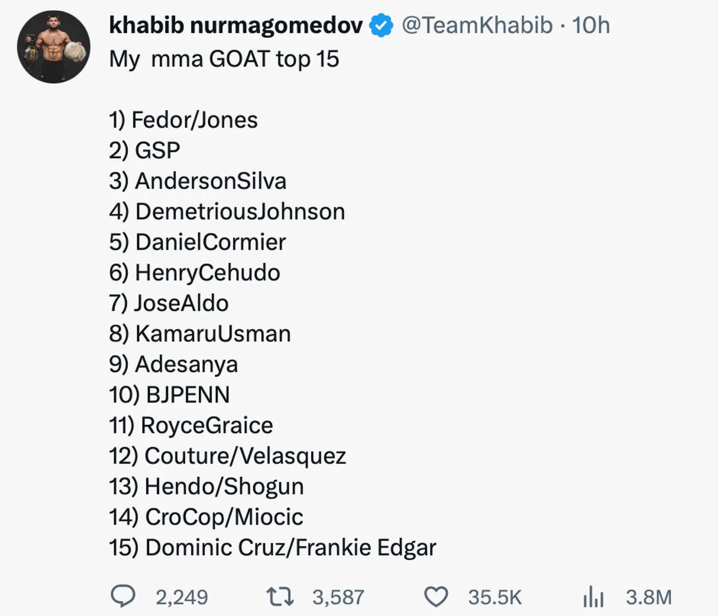 Экс-чемпион UFC Хабиб Нурмагомедов опубликовал свой вариант топ-15 бойцов MMA в истории.