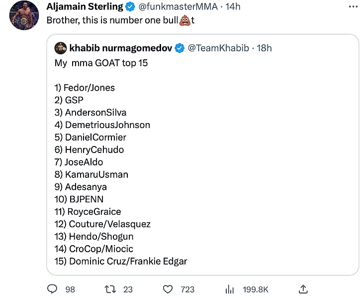 Чемпион UFC Алджамейн Стерлинг отреагировал на список топ-15 сильнейших бойцов MMA, составленный Хабибом Нурмагомедовым.
