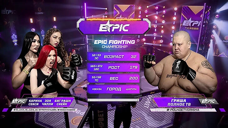 Самым забавным стал поединок с участием ветерана Epic Fighting Гриши Полное ТВ. 200-килограммовый блогер специализируется на боях с женщинами – в 2020-м он уже проиграл Дарье Маздюк. Бой настолько зашел иностранной аудитории, что Маздюк попала в Bellator (пока один бой – поражение). Теперь же против Гриши дрались сразу три соперницы: Биг Рашн Снейк, Карина Секси и Зоя Чили.