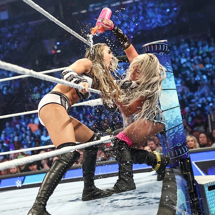 3) Лив Морган и Ракель Родригез победили Челси Грин и Соню Девилль, защитив женские командные чемпионства WWE. Последние бросили свой вызов неделю назад, точнее — попробовали развести на слабо тонной упрёков, причём не только в сторону новоиспечённых чемпионок. Лив и Ракель не стали долго церемониться и сами обозначили изгоев дивизиона как своих оппонентов. Челси и Соня решили заявить о себе полноценно уже на RAW, победив Мию Йим и Кэндис ЛеРэй. За кулисами у чемпионок было небольшое интервью насчёт инцидента на выпуске красного бренда (когда Девилль плеснула воды в лицо Морган и едва не устроила драку). Морган от эмоций принялась быстро говорить о том, что готова устроить проблемы Соне и Челси, но Ракель успокоила Лив с призывом сохранить настрой до начала боя. Лив быстро пришла в себя и закончила на коронной фразе «Watch Us» (на деле коронная фраза Лив «Watch Me», но с учётом нынешнего сюжета... ). Затем свой ответ приготовили Грин и Девилль на рампе, сначала упрекнув зрителей в отсутствии к ним уважения, хотя они будущие командные чемпионки, и понимания того что они прошли ради цели добиться успеха. А после провоцировали Лив, говоря что готовы повторить то что они сделали на RAW хоть сейчас. Не сказать чтоб матч вышел прям плохим – в командных взаимодействиях были свои связующие звенья подстать каждой стороне: грамотная хильская работа претендентов и отдача от чемпионок, особенно от Морган в спотах, отчего Ракель выглядела не столь внушительно. Да и то что матч несмотря на определённый общий брак в спотах был довольно быстрым — также не есть что-то плохое. Просто его сложно было воспринимать вот так позитивно из-за скоротечности всей истории. Чемпионки сменились полторы недели назад, затем образовались первые претендентки и заявили о себе и вот первый матч. Тут либо сразу надо уходить в сторону новых оппонентов или же продолжать противостояние. И второй вариант тут относительно более предпочтительный. Для накала сторилайна и наработки химии, хотя тут с этим будут свои проблемы. Плюс таковой также вытекает и из-за концовки — победу принесла Морган не без помощи от Ракель: Лив вне глаз рефери плеснула водой в глаза и на голову Челси, а Родригез зафиксировала ногами сворачивание от Лив (Личная оценка — 2,75);