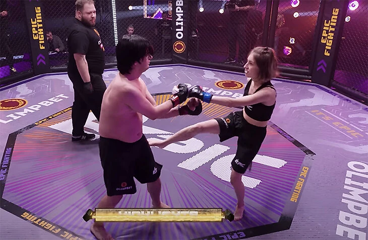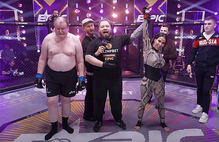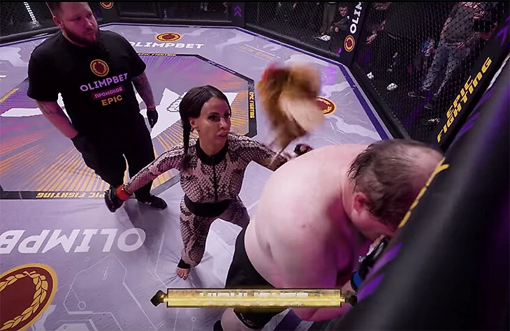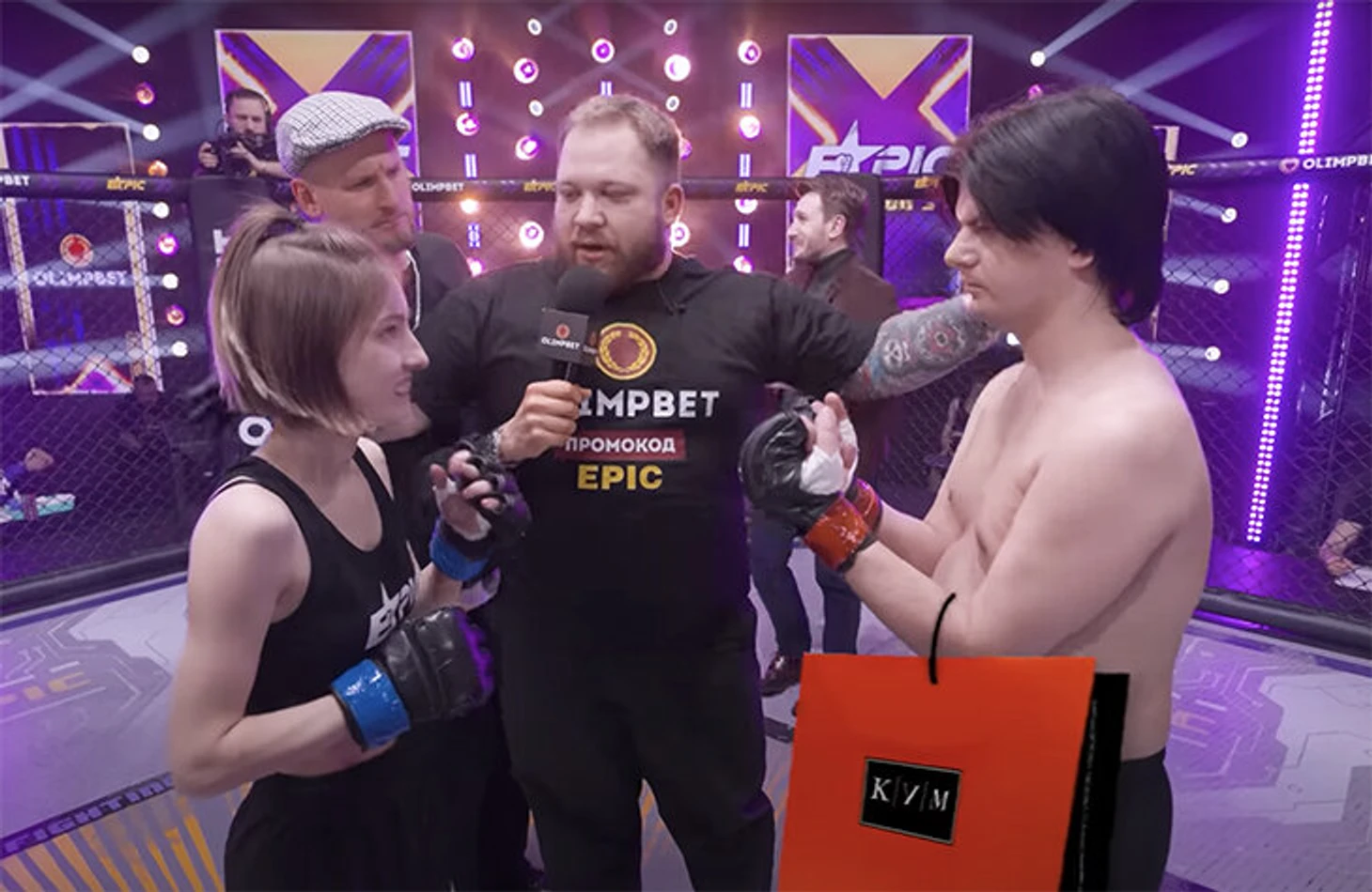 Первым дрался Никита Литвинков – звезда интернета 2000-х из вирусного видео про «борщ с капусткой». Сейчас он борется с депрессией, наряжается в образ Аллы Пугачевой и мелькает на трэш-стримах. Соперница Литвинкова – девушка с очень писклявым голосом. Этого достаточно, чтобы попасть в Epic Fighting.