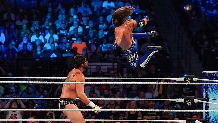 2) Ракель Родригез и Шотци Блэкхарт победили Damage CTRL (Бэйли и ИЙО СКАЙ). Родригез из-за травмы Лив Морган лишилась женских командных титулов, но была включена в состав специального поединка на четыре команды-участниц. Как и Damage CTRL, которые успели позлорадствовать на тему травмы Морган, также указав что и Дакота Кай не ушла с того титульного поединка 2 недели назад целой и здоровой. Шотци же стала новым партнёром Ракель по команде после столкновения на последнем выпуске красного бренда на этой же неделе с Соней Девилль, которую страховала Челси Грин и решившая выпендриться из-за этого. Шотци пришла на помощь и тем самым добилась внимания от Ракель. Матч хоть и прошёл на командных рельсах, чтоб подготовить почву для многосторонника в следующий понедельник после PLE и показав стороны как полноценно подготовленные команды. Но также тут было много хаотичности и нестройностей в коммуникациях оппонентов. Это давало некий шарм и обозначало как команды отчаянно сражаются за преимущество на будущее. Плюс что удивительно — уже не в первый раз показывается что у Шотци и Ракель куда более чёткая и даже отлаженная химия как команды, чем у Ракель было с Алией и с Лив Морган. Хотя это и странно, учитывая что с Алией и Лив Ракель пришлось работать дольше, но какие-то определённые проблемы коммуникаций оставались, а с Шотци такого не видно и не чувствуется. Также примечательно что несмотря на командную доминацию от Damage CTRL, это также стало препятствием для них самих, ибо Бэйли пыталась сфокусировать внимание на своей тактике, а Скай напирала вперёд и показывала самую себя во всей красе. Это и стало причиной их поражения – Бэйли не удалось удачно зафиксировать атаку sunset flip на Родригез, а Шотци стала целью для Ийо, которая вместо сэнтона на Ракель полетела дропкиком на Блэкхарт. Таким образом Ракель использовала заминку для удержания, просто по сути сев на Бэйли (Личная оценка — 3);