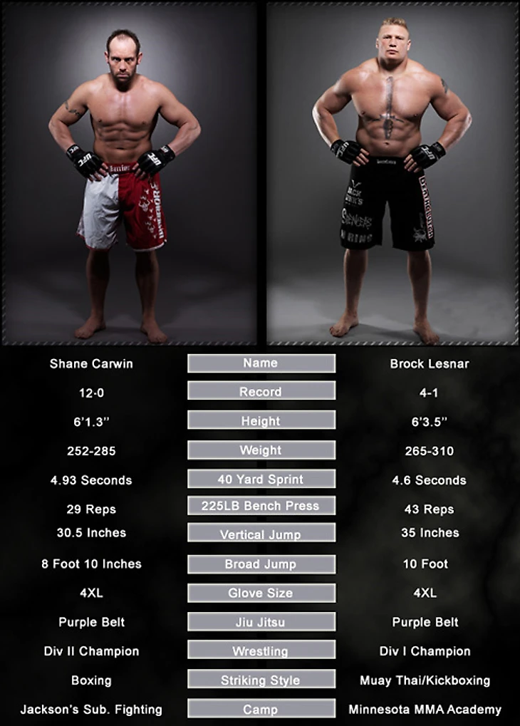 Вопрос об обладателе титула во многом сводится к тому, кто первым пойдет вперед и что будет после этого. Леснара еще никто как следует не проверял в стойке, хочется, наконец, увидеть, что будет, когда в голову этого гиганта прилетит порция хороших, поставленных ударов, и что он придумает, чтобы этого избежать. В свою очередь, Карвин самый тяжелый из всех, с кем приходилось биться Броку, а это значит, что его так просто смести и забить не получится.