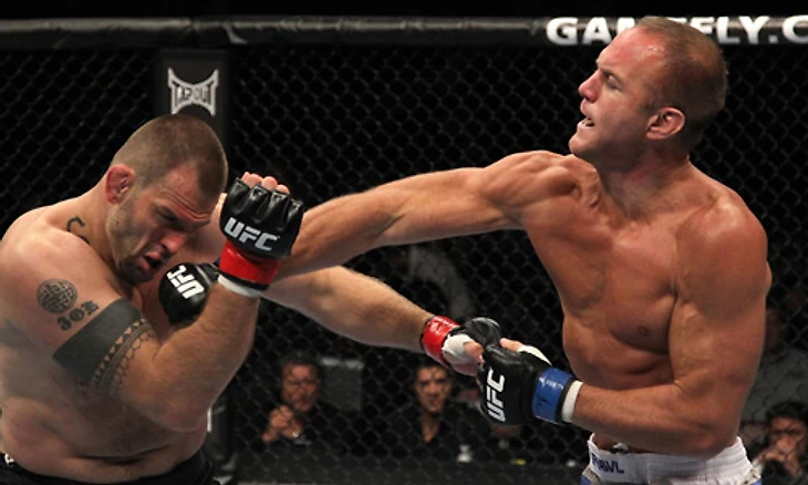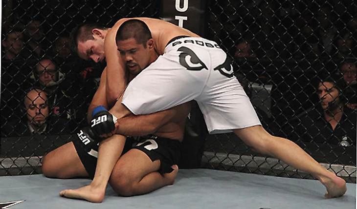 Давайте представим, что мы не знаем, почему вылетел Леснар, и тогда нас никто не упрекнет за слова, «хорошо, что Леснар вылетел». Дос Сантос – Карвин, на самом деле, во сто крат интереснее: умение срубить против умения перебить, умение бороться против молодости, даже преимущества в росте и длине рук они поделили поровну. Карвин мог переводить в партер, ведь он «занимается этим с шести лет», мог попасть, – все же предрасположенности к одному решающему удару в нем больше. Пяти минут Шейну хватило, чтобы получить оба шанса и оба потратить. Попадать нужно было у сетки, в бою с Миром это получилось, и вообще с апперкотами у американца все в порядке, а бороться, видимо, стоило начинать с пяти лет, потому как Дос Сантос без труда уходил от перевода в партер.