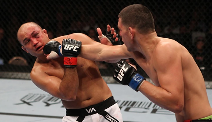 Ник Диаз дрался с Би Джей Пенном. Именно дрался, никаких «выходил против», «боролся», «сражался». Может оно и к лучшему, что все так случилось с отменой титульного поединка. Сен-Пьер вполне способен вести бой, и, когда это происходит, сам бой, как правило, получается скучным. Здесь же не было времени определять, кто работает первым номером.