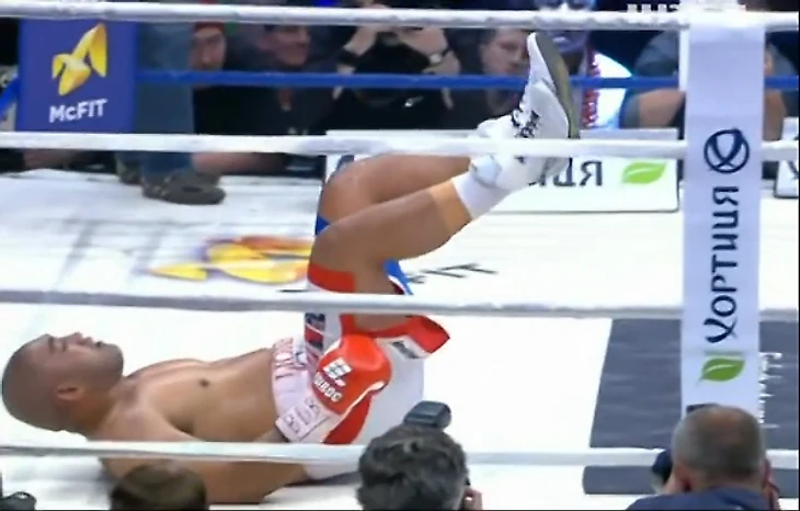 23.50. 3-й раунд: нет, долго Нсафоа не продержался. Александр немедленно принялся за дело и после небольшой комбинации положил ганца на настил. Бен встал, исполнил не-боевой гопак, упал еще раз (без нокдауна), а затем Усик провел отличную двойку правый-левый, и Нсафоа как сноп сена упал на настил. Рефери Юрген Лангос счел за благо сразу позвать докторов, а не отсчитывать.