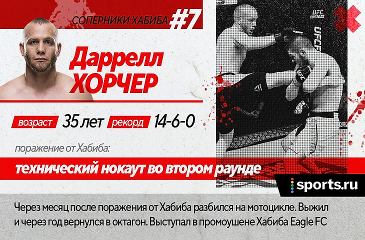 Спустя всего месяц после боя с Хабибом Хорчер попал в жуткую аварию: его мотоцикл столкнулся с легковой машиной, которая выехала на встречную полосу. Удар был настолько сильным, что Хорчер вылетел из седла, а сам мотоцикл просто взорвался. Даррелл выжил и через год вернулся в октагон.