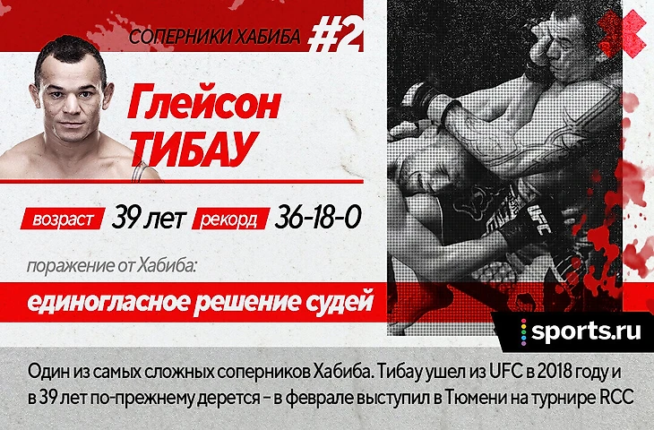 Бой с Тибау считается самым сложным в карьере Нурмагомедова. Глейсон перебил Хабиба в стойке, защитился от всех попыток перевода, а большинство независимых специалистов с портала MMA Decisions присудили победу именно ему. Несмотря на это, обслуживавшие поединок судьи отдали Нурмагомедову каждый из раундов.