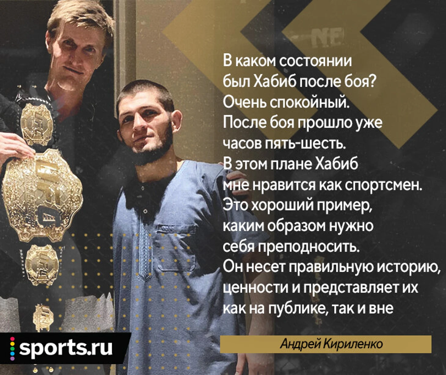 – Очень спокойный. После боя прошло уже часов пять-шесть. В этом плане Хабиб мне нравится как спортсмен. Это хороший пример, каким образом нужно себя преподносить. Он несет правильную историю, ценности и представляет их как на публике, так и вне.