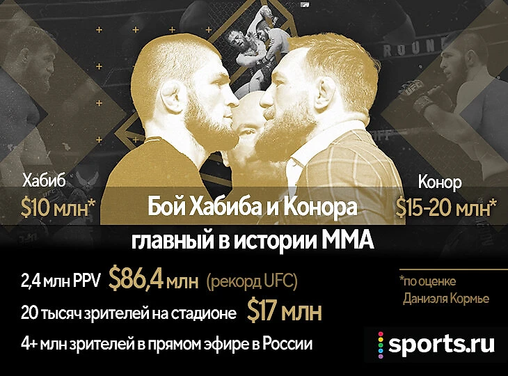 Для Конора фиксированный гонорар в $3 млн не был рекордным – до этого он получал столько за Нейта Диаса и Альвареса. Зато для Хабиба это был прорыв – в титульнике с Яквинтой он получил лишь $500 тысяч. Хабиб медийно взлетел после Конора, и его фиксированный гонорар (против Гейджи и Порье) не падал ниже $3 млн.
