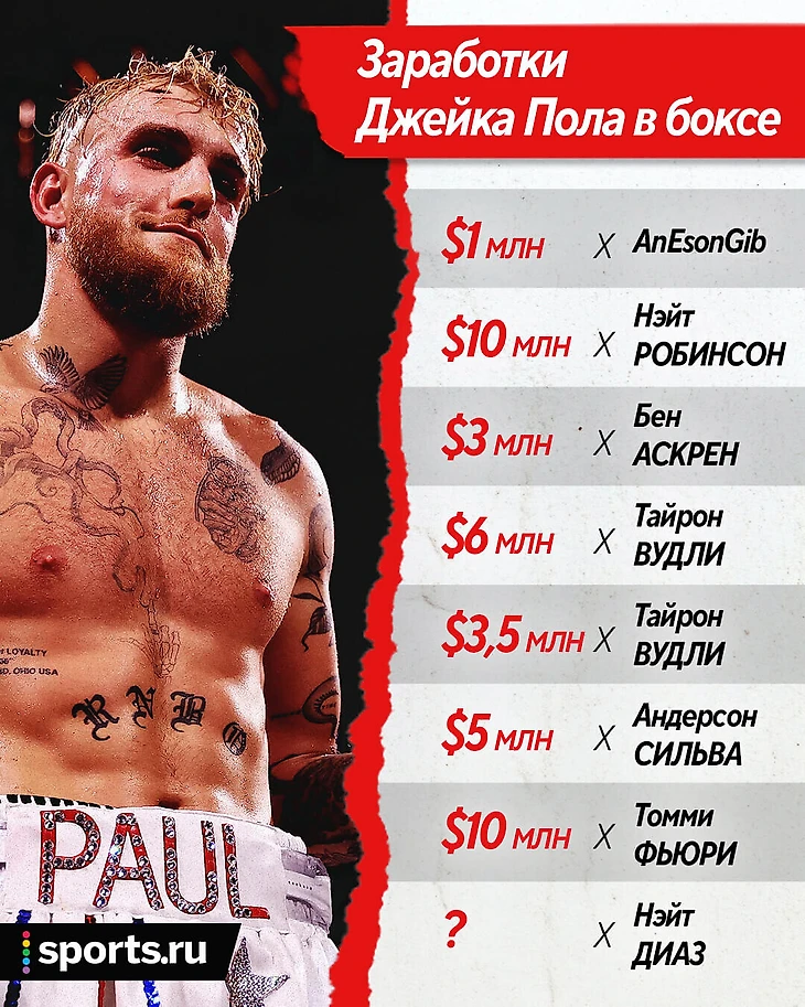 В последний раз Пол дрался в феврале – поединок против брата Тайсона Фьюри Томми прошел в Саудовской Аравии. Несмотря на поражение, ставшее для блогера первым на профессиональном ринге, Пол не сильно расстроился – по словам представителя промоутерской компании MVP, поединок собрал более 800 тысяч платных трансляций, а гонорар Пола составил $30 млн. Журналист Дэйв Мельтцер приводит более скромные данные, но и они впечатляют – по его информации, блогер заработал около $10 млн.