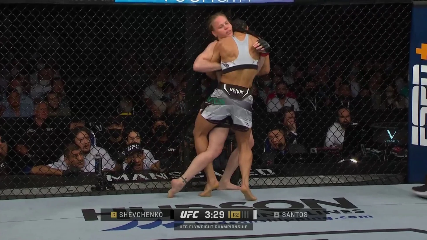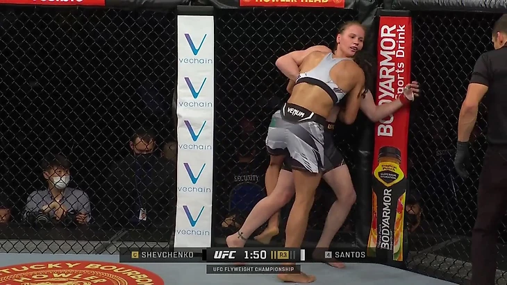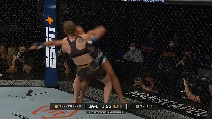Против Сантос Шевченко несколько раз давала разворачивать себя слишком легко в тех клинчах, которые сама же инициировала. Она поджимала соперницу к клетке, давила, но через несколько секунд отдавала позицию у клетки и контроль Сантос. И та этим дважды воспользовалась, проведя одинаковые подсечки.