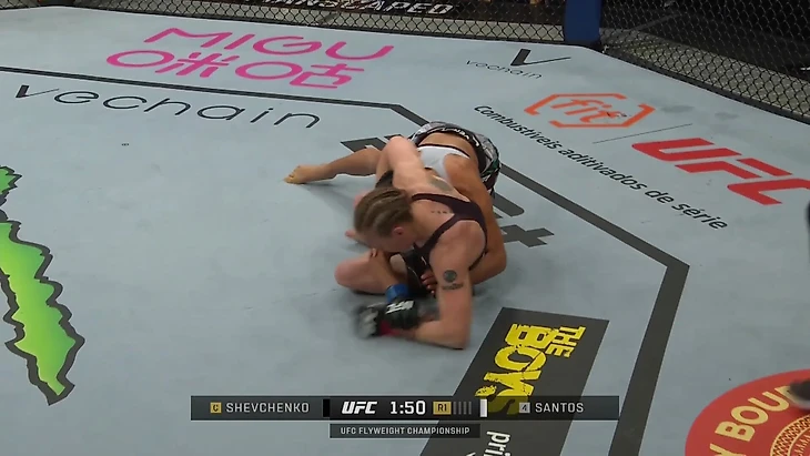 В поединке против Тайлы Сантос, которая неплохо умеет бороться и сильнее физически, Шевченко попробовала стягивание из клинча. Это закончилось контролем спины для Сантос и проигранным раундом. Стоит отметить, что Шевченко выигрывала первый раунд поединка в стойке, но по какой-то причине решила бороться и в итоге его отдала.