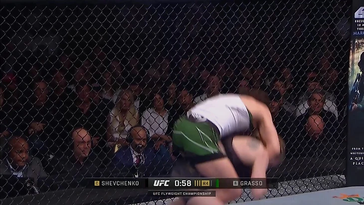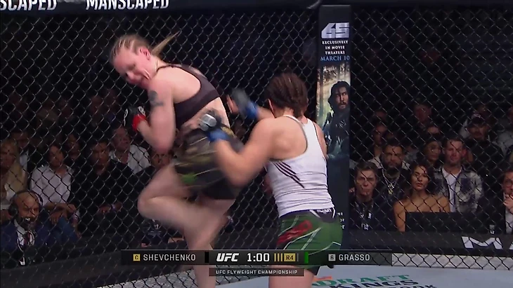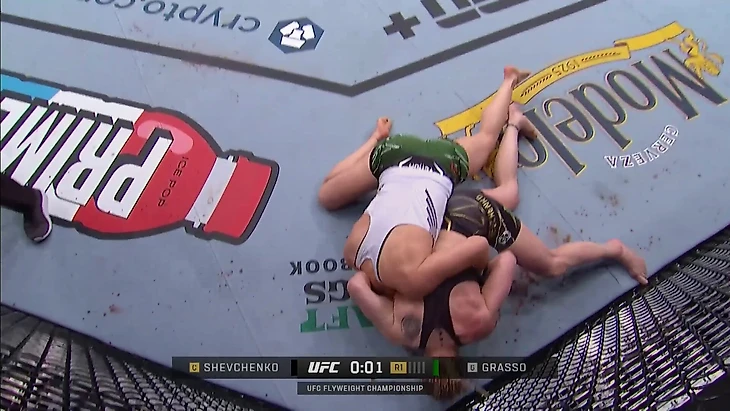 В поединке против Грассо было значительно меньше клинчей, но и здесь нужно отметить важный момент. В конце первого раунда Алекса Грассо сделала попытку тейкдауна, Шевченко защитилась, после чего они перешли в клинч. Там Грассо нанесла несколько ударов, после чего Шевченко попыталась сделать такой же бросок скручиванием через бедро, как и в поединке против Сантос, но в результате точно так же отдала спину, хоть и с контролем шеи.