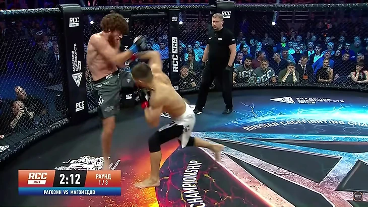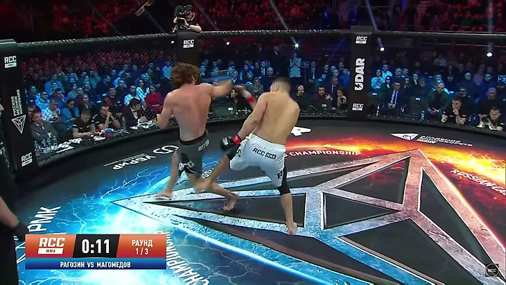 Поединок, после которого Шару Буллета подписали в UFC, прошел в декабре-2022 против Михаила Рагозина. Весь первый раунд проходил по обычному сценарию поединков Магомедова: он держал соперника на дистанции киками, не давая выйти на ближнюю дистанцию и замедляя передвижение. Рагозин пытался контрить. Один из вариантов – контратака на миддл-кик Магомедова: