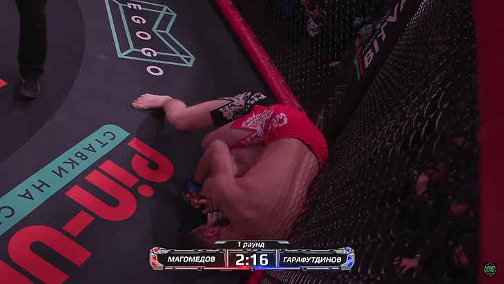 Магомедова спасло правило 30 секунд в партере. Рефери поднял бойцов в стойку, после чего Шара Буллет снова отдал спину – на этот раз уже в стойке после неудачного бэкфиста. Гарафутдинов повис на спине Магомедова, после чего они упали в партер. Спустя 30 секунд бойцы снова вернулись в стойку, и там Магомедов все-таки попал бэкфистом, который пошатнул Гарафутдинова.