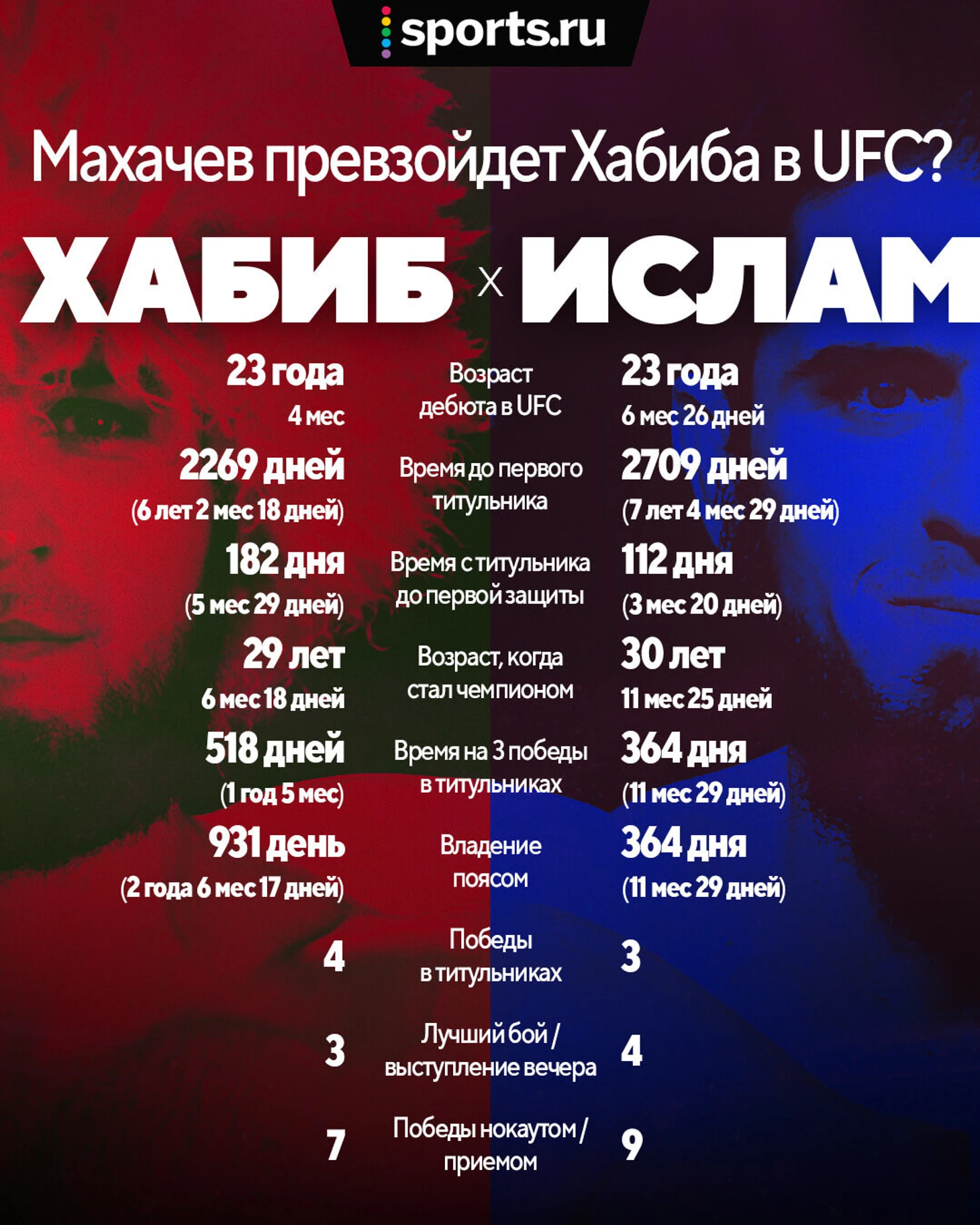 Исламу Махачеву почти 32 года, но он провел больше боев и, очевидно, как минимум еще несколько раз выйдет в октагон – Хабиб в таком возрасте уже ушел из MMA (пусть и на фоне смерти отца и желания матери, чтобы сын закончил с боями).