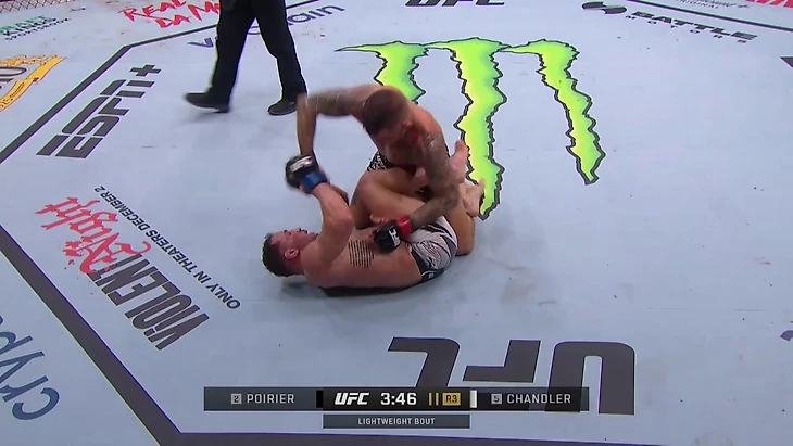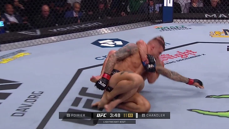 Порье контрит попытку Чендлера закрыть замок, удерживая одну ногу рукой и заваливаясь на вторую