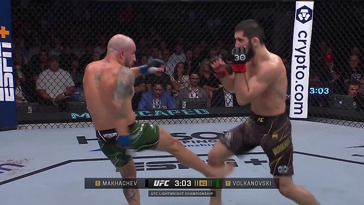 Эксперты прогнозировали, что Махачев будет контрить сближения Волкановски через клинч и колени. Но вместо этого он показал хорошую работу ног (как на скриншотах выше) и отлично контратаковал на ближней дистанции.