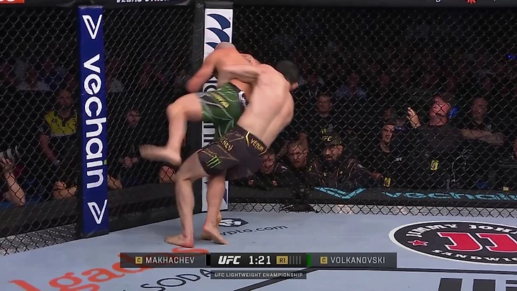 Волкановски тянет правой рукой левую ногу Махачева, лишая его равновесия