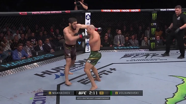 Важно отметить колени в корпус. Большой урон от этих ударов задолго до боя прогнозировал Хабиб: «Что произойдет с Волкановски? Клинч и много ударов коленями. Он пропустит немало ударов коленями».