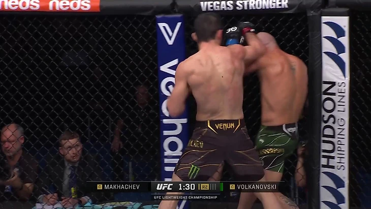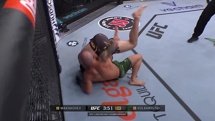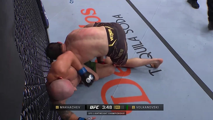 Волкановски стоит на колене и прижал Махачева к сетке – для обоих бойцов форсировать дальнейшее развитие позиции рискованно.