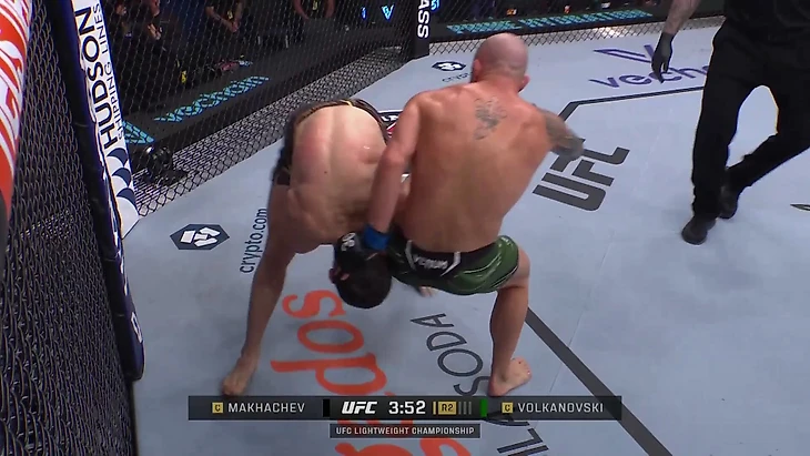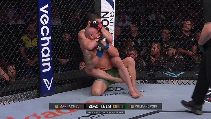 Еще у Волкановски свободна правая рука – важная точка опоры. В такой ситуации даже Махачеву не хватило физической силы, чтобы удержать соперника на земле.