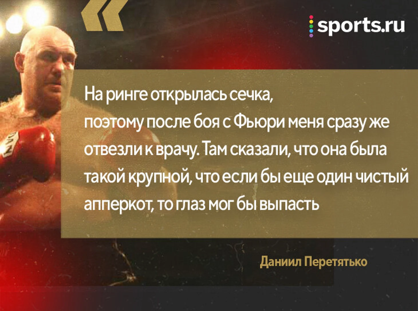 «Фьюри сказал: «Сильно бьешь. Меня еще так не били». Из-за рассечения судья снял Перетятько с боя