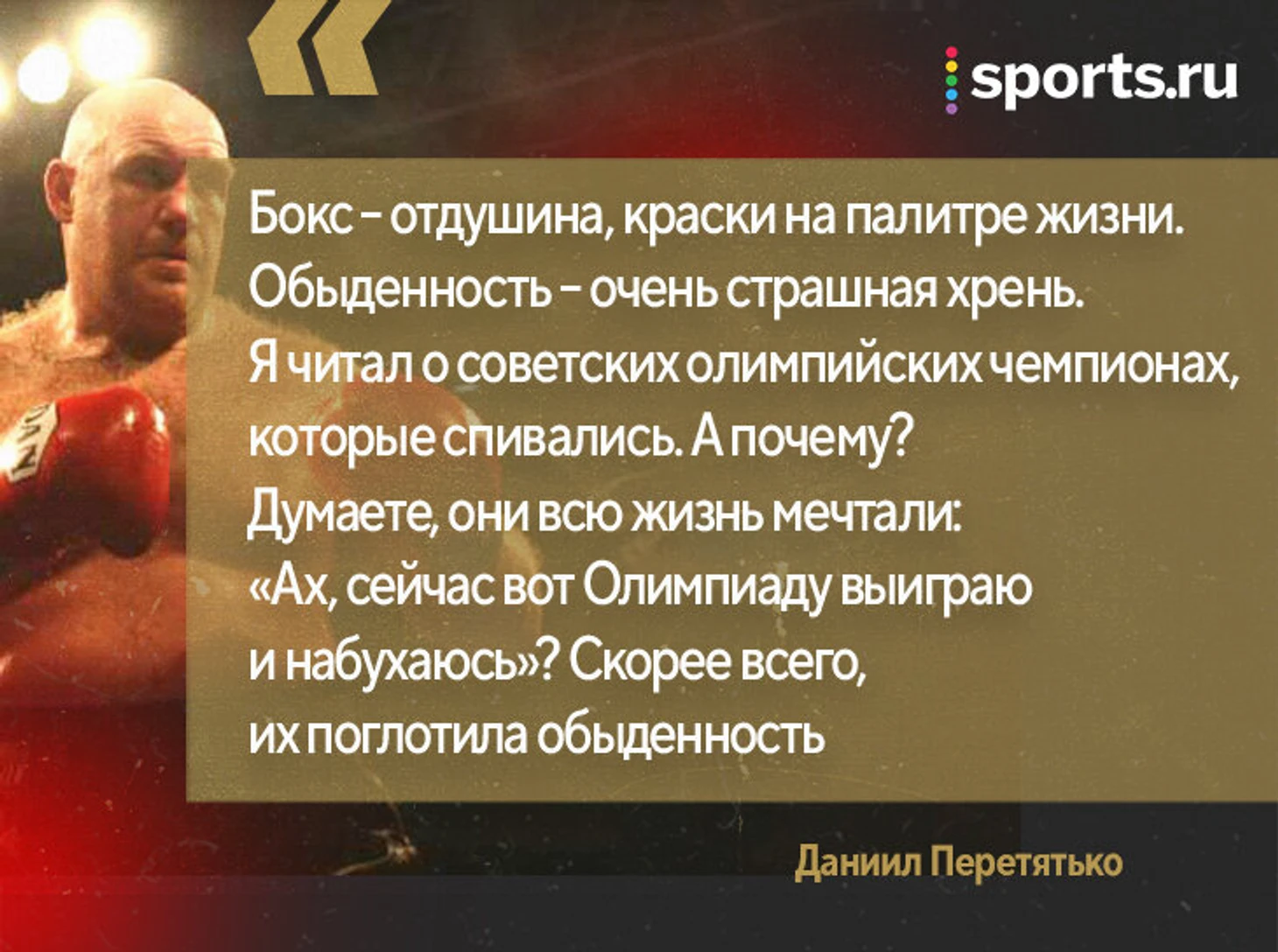 Бокс – отдушина, краски на палитре жизни, где можно было что-то раскрасить. Никакого негатива в серой жизни нет. Но обыденность – очень страшная хрень. Я читал о советских олимпийских чемпионах, которые спивались. А почему так? Думаете, они всю жизнь мечтали: «Ах, сейчас вот Олимпиаду выиграю и набухаюсь»? Нет. Скорее всего, их поглотила обыденность, с которой они не справились.