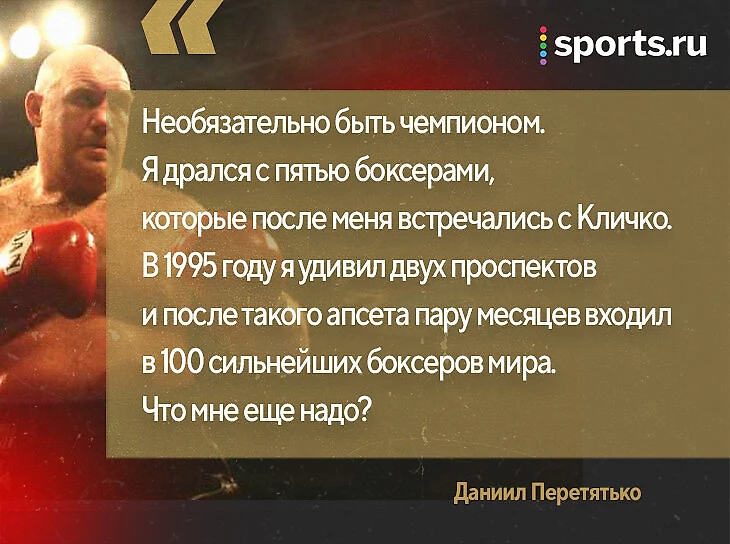 – Необязательно быть чемпионом. Я дрался с пятью боксерами, которые после меня встречались с Кличко. В 1995 году я удивил двух проспектов и после такого апсета пару месяцев входил в 100 сильнейших боксеров мира. Что мне еще надо?