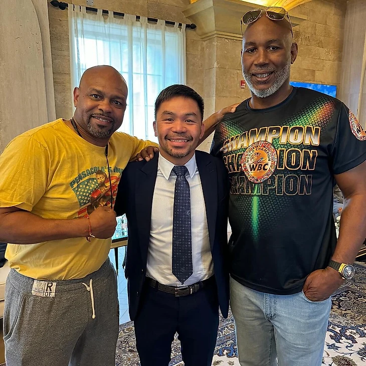 В компании с Пакьяо засветился Дмитрий Бивол, которому тот пожал руку. Сам Бивол опубликовал совместное фото с Пакьяо, Леонардом и Хаттоном.
