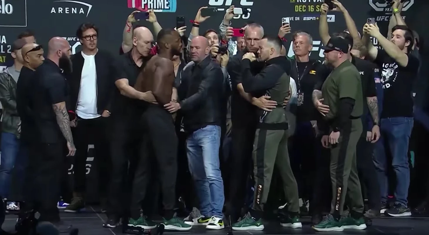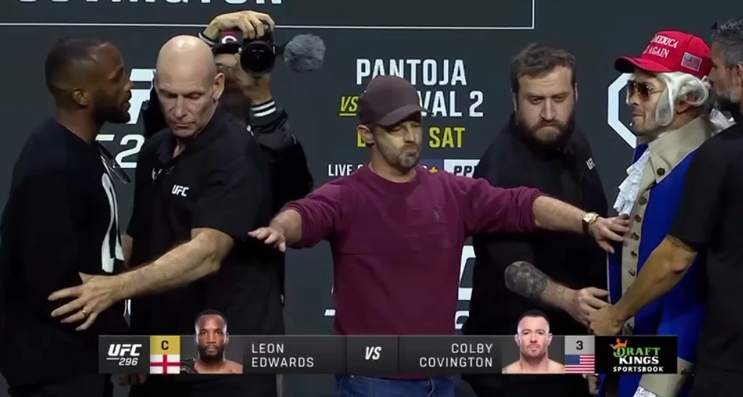 Вот так завершилась встреча Леона Эдвардса и Колби Ковингтона (ох, что за костюм?) на пресс-конференции.