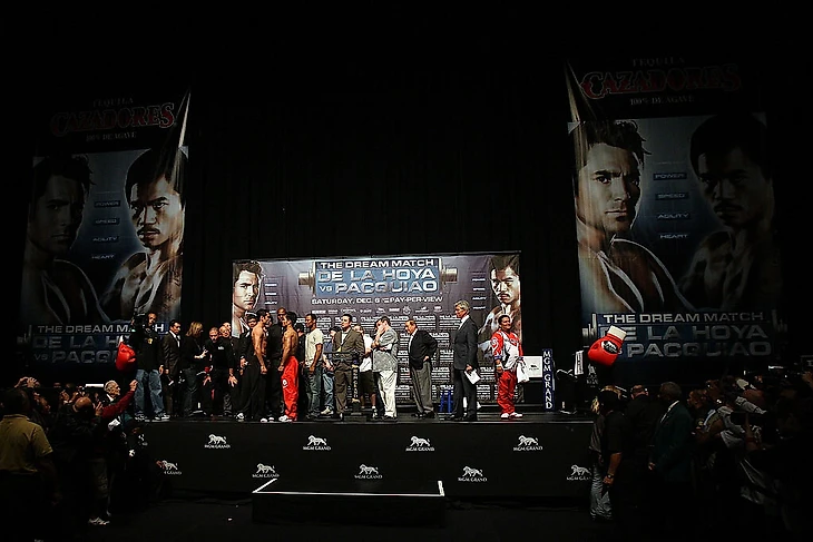 Хотя к тому моменту он уже разбил элиту мексиканского бокса: Марко Антонио Баррера, Эрик Моралес, Хуан Мануэль Маркес, Эктор Веласкес и Хорхе Солис. Но Пакьяо ни разу не переваливал за 400 тысяч платных трансляций, а Де Ла Хойя делал миллионные рейтинги и был ведущей стороной в переговорах даже с Мейвезером.
