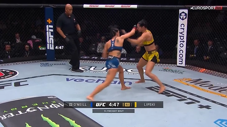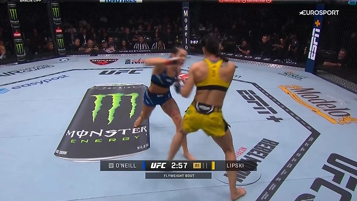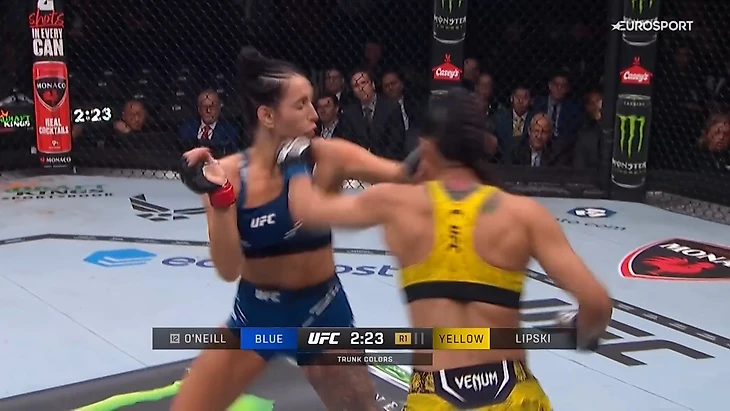 Сразу после этого Липски начала давить, а О’Нилл бросилась искать спасение в проходе в ноги. Позицию на земле О’Нилл мгновенно проиграла и пропустила череду тяжелых ударов в партере. Попытка закинуть удушающий на шею у Липски не прошла, но она изящно перешла на болевой на локоть и заставила противницу постучать.