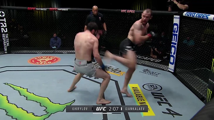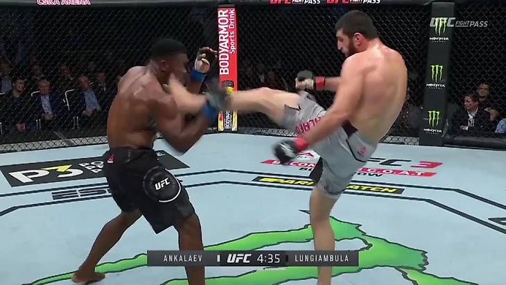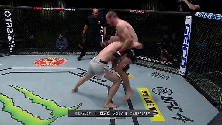 В работе на земле Анкалаев стабильно выигрывает спорные ситуации, быстро реагирует в переходных моментах из борьбы в стойку и обратно. Сабмишенов от него мы ни разу не видели, а против него была лишь одна попытка (оказалась успешной). Да, тот самый бой против Пола Крейга, закончившийся поражением Анкалаева на последней секунде.