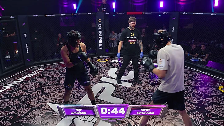 Забытые поп-звезды дрались в боксерских шлемах и перчатках, в первых двух раундах показав бесконтактный бой. Джейсон весьма техничный: приехал на бой с тренером, в клетке – копировал движения Роя Джонса. В третьем раунде певцы пристрелялись: Богомазов сдался, когда из носа потекла кровь.