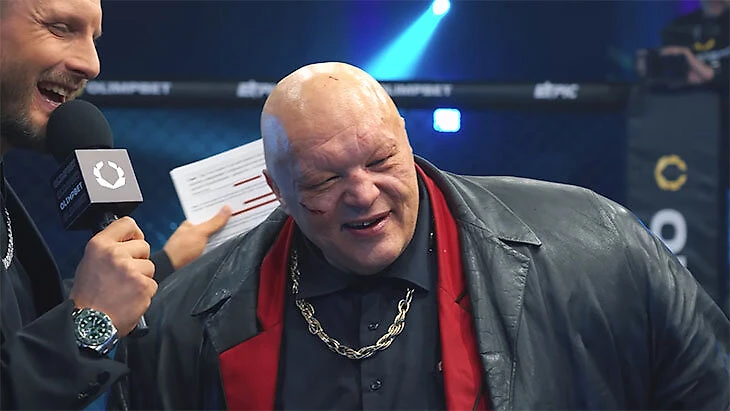 Барецкий вышел в фирменном кожаном плаще и красном пиджаке – добавились перчатки для ММА. Он показал фирменный трюк, разорвав зубами банку пива. На двоих бойцам почти 100 лет, а Барецкий – на 100 кг тяжелее.