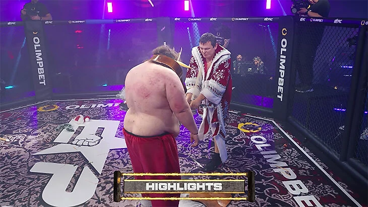 Главное событие – первый за более чем полгода турнир. Его открыл Леня Голубков из рекламы МММ со скетчем про постновогоднее похмелье. Дальше – ремейк «Жмурок», где актеров заменили бойцы Epic Fighting. Сначала сцена на стадионе, затем визит к Доктору, которого в фильме играет Алексей Серебряков, а в ремейке – Олег Монгол. Диалоги забавно переписали: