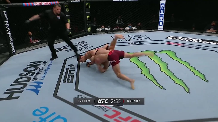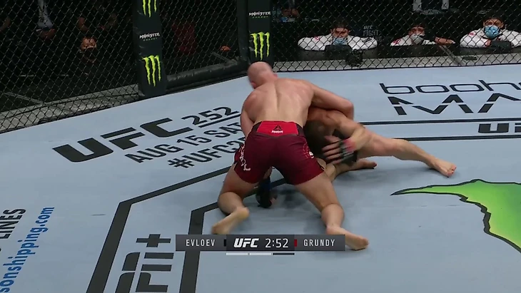 Если посмотреть на статистику, то у Евлоева достаточно низкий показатель защиты от тейкдаунов. Но большинство тейкдаунов он пропустил против Майка Гранди, который получил лишь 2,5 минуты контроля после шести выполненных проходов. Причина – Евлоев очень быстро и технично встает после пропущенных проходов: