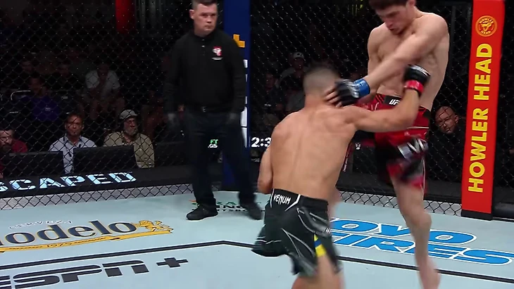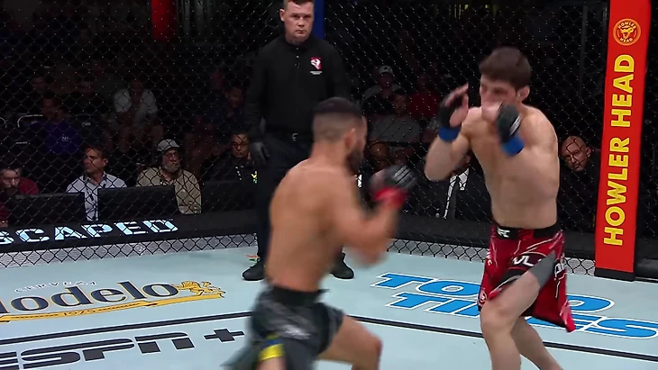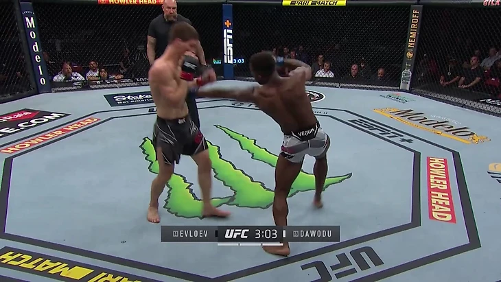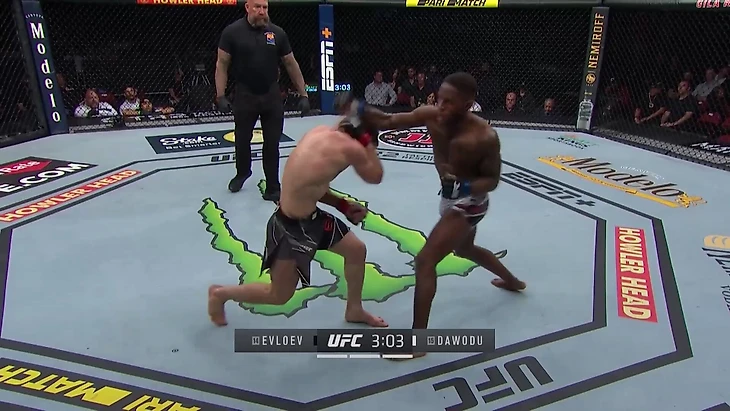 Евлоев пробил джеб, Хаким Давуду оттянулся и сконтрил правым прямым. Евлоев сделал уклон-нырок влево