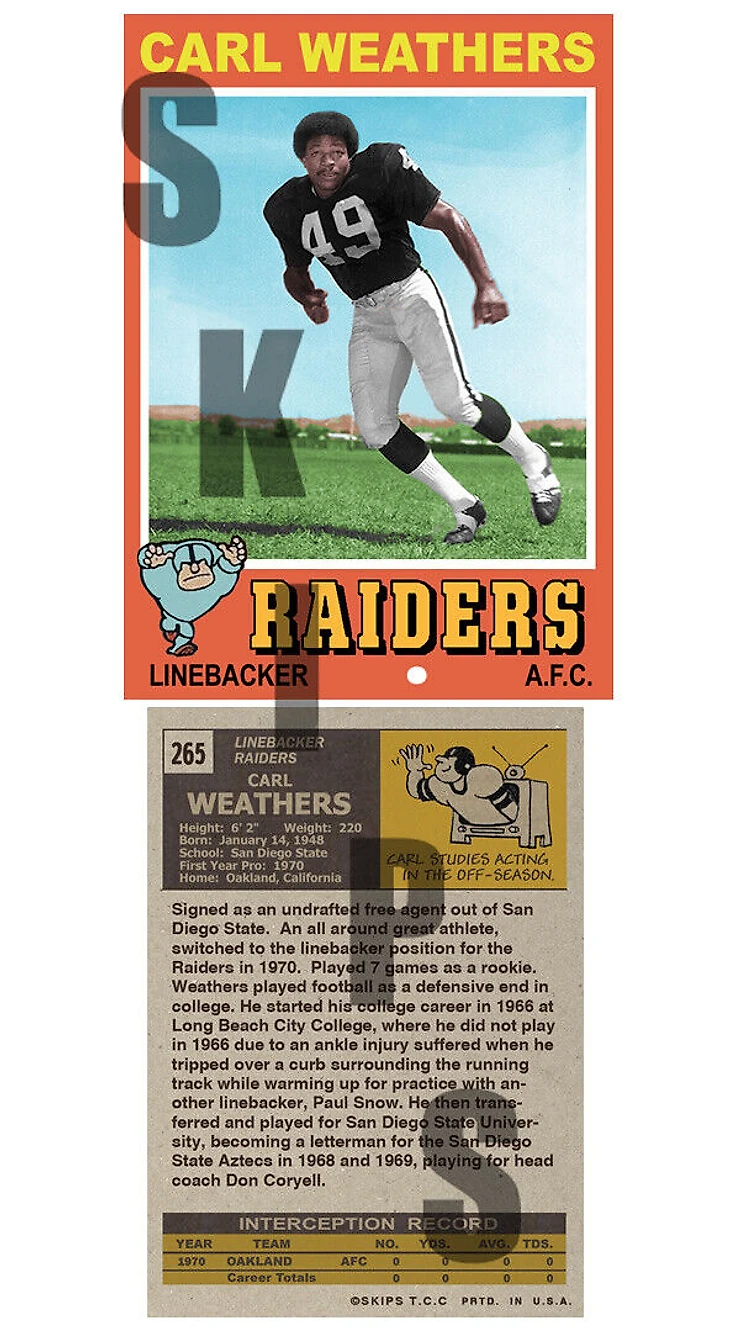Напоследок последнего поклона — спортивное и историческое. Уэзерс играл в амфут за «Ацтеков» во время учебы в Сан-Диего (SDSU) с 1968 по 1970, а потом, как многие из вас уже узнали, за «Рейдерс» (1970-1971).
