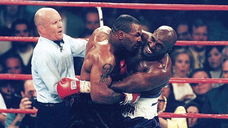 Холифилд доминировал в первых двух раундах, после чего Тайсон начал яростную атаку в третьем раунде. Эвандеру приходилось искать спасение в клинчах. Когда Майк понял, что его удары не наносят особого урона, то в одном из клинчей он откусил сопернику мочку уха.
